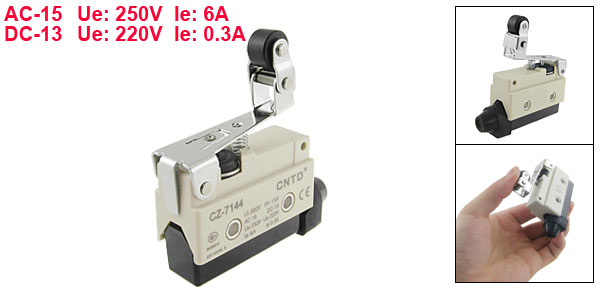 Product Name Micro Switch Model No. CZ-7144 Actuator Type Short Hinge Roller Lever Contact Type 1 NO, 1 NC, 1 Com Terminal Type Screw Terminals Ui 380V Ith 10A AC-15 Ue: 250V, le: 6A DC-13 Ue: 220V, le: 0.3A Roller Wheel Size 12.4 x 7.9mm / 0.5" x 0.31"(Diameter*T) Overall Size(Approx.) 70 x 22 x 76mm / 2.8" x 0.9" x 3.0"(L*W*H) Material Metal, Plastic & Rubber Net Weight 59g Package Content 1 x Micro Switch - Reviews