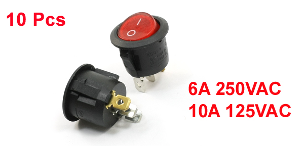 Product Name Rocker Switch Action SPST Terminals 3 Pin (ON-OFF) Light COlor Red Rating Voltage 6A 250VAC 10A 125VAC Total Size 3 x 2.3cm/1.2" x 0.9"(H*D) Mounting Dia 1.8cm/0.7" Color Red, Black, Silver Tone Material Plastic & Metal Total Weight 51g Package Content 10 x Rocker Switch - Reviews