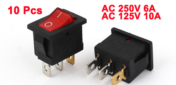 Details6A AC 250V 10A AC 125V 3Pin 2Position SPST Red LED Rocker Switch 10 Pcs  Main Color Black,Red Country of Manufacture CHINA Light color Red LED Material Plastic,Metal Contact Type SPST Total Size 28 x 21 x 15mm/1" x 0.8" x 0.6"(L*W*H) Mount Size 18 x 12mm/0.7" x 0.5"(L*W) Product Name Rocker Switch Pins 3-Pin Rated AC 250V 6A, AC 125V 10A Net Weight 62g Package Content 10Pcs x Rocker Switch Positions 2 Position