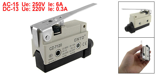 Product Name Micro Switch Model No. CZ-7120 Actuator Type Long Straight Hinge Lever Contact Type 1 NO, 1 NC, 1 Com Terminal Type Screw Terminals Ui 380V Ith 10A AC-15 Ue: 250V, le: 6A DC-13 Ue: 220V, le: 0.3A Lever Size 79 x 6.5mm / 3.1" x 0.256"(L*Tip Width) Body Size(Approx.) 70 x 22 x 40mm / 2.8" x 0.9" x 1.57"(L*W*H) Material Metal, Plastic & Rubber Net Weight 54g Package Content 1 x Micro Switch - Reviews