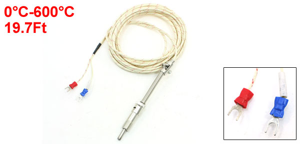 Product Name Thermocouple Type K Type, Tension Spring Sleeve Temperature Range 0°C-600°C Probe Size 5 x 30mm/ 0.2" x 1.2" (D*L) Thread Diameter 12mm/ 0.47" Cable Length 6 Meters / 19.7Ft Net Weight 129g Package Content 1 x Thermocouple - Reviews