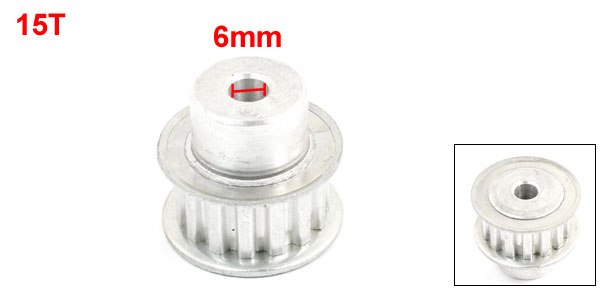 Product Name Timing Pulley Type XL15 Number of Tooth 15T Pitch 5.08mm/1/5" Bore Diameter 6mm/0.24" Top Diameter 18mm/0.7" Overall Size 28 x 25mm/1.1" x1"(D*H) Fit Belt Width 11mm/0.43" Materials Alumnum Color Silver Tone Weight 27g Package Content 1 x Timing Pulley - Reviews
