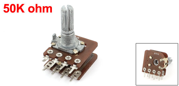 Product Name Potentiometer Type B50K Resistance Value 50K ohm Adjustment Type Top Adjustment Type Linear Dual(Type B) Features Knurled Shaft Pin Number 8 Shaft Size 6 x 13mm /0.24" x 0.5"(D*L) Mounting Thread Diameter 7mm / 0.28" Base Size 21 x 21 x 10mm / 0.83"x 0.83" x 0.4"(L*W*T) Total Length 31mm / 1.2" Material Metal, Electronic Parts Weight 10g Package 1 x Potentiometer - Reviews