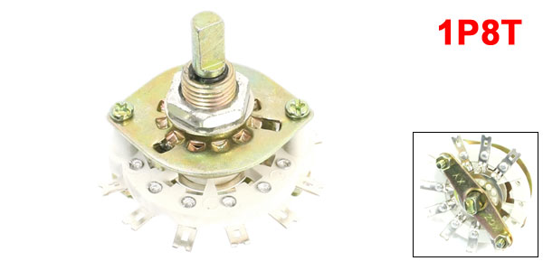 Product Name Rotary Switch Model KCZ-1x8 Contact Type 1 Pole 8 Position(1P8T), 1 Deck Fit Mounting Hole Diameter 10mm / 0.39" Rotating Shaft Dia 6mm / 0.24" Pin Number 9 Dimensions 4.5 x 4.5cm / 1.8" x 1.8"(Max.D*H) Material Metal, Ceramic Net Weight 35g Package Content 1 x Rotary Switch - Reviews
