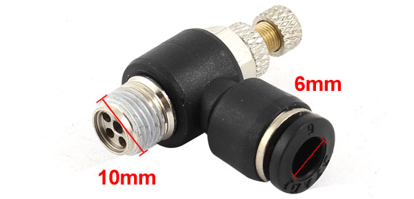 Details6mm Dia Tube 10mm Threaded Pneumatic Speed Controller Quick Connector  Product Name Pneumatic Speed Controller Inner Diameter 6mm / 0.24" Thread Outer Diameter 10mm /0.39" Total Size 38 x 32 x 14.5mm / 1.5" x 1.26" x 0.57" (L*W*T) Material Plastic, Metal Color Black, Silver Tone Weight 17g Package Content 1 x Speed Controller