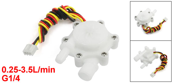 Product Name Water Flow Sensor Model SEN-HW06FB Flow Range 0.25-3.5L/min Working Voltage & Current DC3V-18V, 10mA Rated Voltage DC5V Pulse Duty Factor 50 % High Level of Pulse Output >4.5V (DC5V) Low Level of Pulse Output <0.5V (DC5V) Max Pressure 0.8Mpa Insulation Performance 100MΩ Connector Type 3Pin JST Connector Main Material Plastic Total Size 63 x 40 x 22mm / 2.5" x 1.6" x 0.87"(L*W*T) Inlet Diameter 6mm/0.24" Male Thread Port Diameter G1/4 Cable Length 32cm / 12.6" Body Color White Weight 26g Package Content 1 x Water Flow Sensor - Reviews