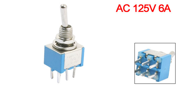 Product Name Toggle Switch Type DPDT (Latching) Position 3 Positions (ON/OFF/ON) Voltage, Current AC 125V 6A Mounting Thread Diameter 6 mm / 0.24" Main Body Size 13 x 11 x 9mm / 0.5" x 0.43" x 0.35" (L*W*H) Overall Height 3cm / 1.2" Color Blue, Silver Tone Net Weight 4g Package Content 1 x Toggle Switch - Reviews