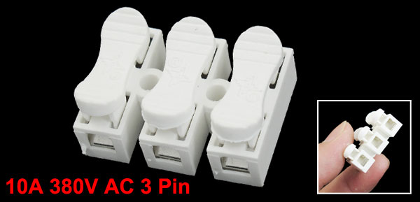 Product Name Spring Terminal Block Rated Value AC 380V, 10A Pin Number 3 Pitch 6mm/0.24" Total Size 28 x 20 x 13mm/ 1.1" x 0.79" x 0.51" (L*W*H) Material Plastic Color White Weight 4g Package Content 1 x Spring Teminal Blocks - Reviews