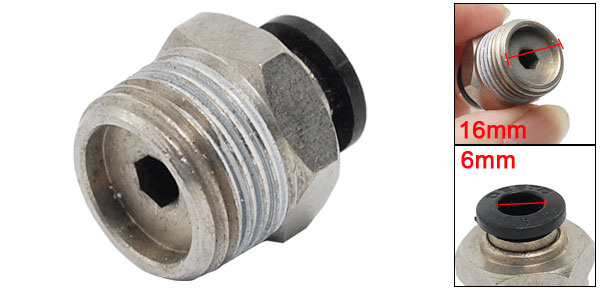 Details6mm Pneumatic Air Push to Quick Connect Fittings Connector New  Item Name Quick Fittings Total Size 20 x 17mm/ 0.78" x 0.67"(L*W) Thread Diameter 16mm/ 0.629" Inner Diameter (Blue End) 6mm/ 0.236" Material Alloy, Plastic Color Black, Silver Tone Weight 20g Package Content 1 x Quick Fittings
