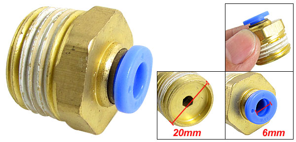 Item Name Quick Fittings Total Size 21 x 21mm/0.8" x 0.8"(L*W) Thread Diameter 20mm/0.787" Inner Diameter (Blue End) 6mm/0.236" Material Chrome Plated Brass & Plastic Color Gold Tone, Blue Weight 34g Package Content 1 x Quick Fittings - Reviews