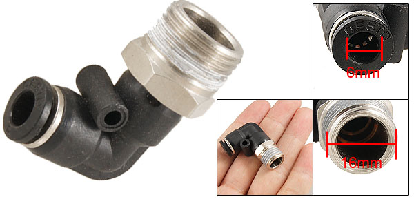 Product Name Pneumatic Quick Fittings Type Elbow Type One Touch Connector 6mm/ 0.24" Thread Connector 16mm/ 5/8" Material Plastic & Metal Size (Approx) 3.6 x 2.8 x 2cm/ 1.42" x 1.1" x 0.79" (L*W*T) Color Black, Silver Tone Weight 20g Package Content 1 x Pneumatic Quick Fittings - Reviews