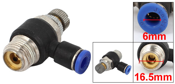 Product Name Speed Control Fitting Material Plastic, Metal Thread OD 16.5mm / 0.649" Thread Size 3/8" PT Inner Diameter (Blue End) 6mm/0.236" (15/64") Total Size (Each ) 46 x 37 x 21mm/1.81" x 1.45" x 0.83"(L*W*T) Color Black, Blue, Silver Tone Weight 50g Package Content 1 x Speed Control Fitting - Reviews