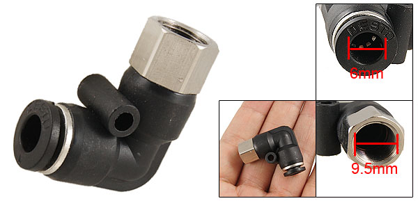 Product Name Pneumatic Quick Fittings Type Elbow Type One Touch Connector 6mm/ 0.24" Thread Connector 9.5mm/ 3/8" Material Plastic & Metal Size (Approx) 3.1 x 2.6 x 1.2cm/ 1.22" x 1.02" x 0.47" (L*W*T) Color Black, Silver Tone Weight 11g Package Content 1 x Pneumatic Quick Fittings - Reviews