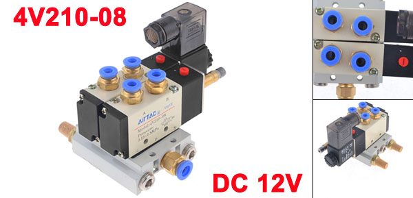Product Name Solenoid Valve w Base Muffler Model 4V210-08 Working Pressure 0.15-0.8Mpa Working Voltage DC 12V Working Power 4W Current 125mA Voltage Range DC19.2-26.4V Position & Way Number 2 Position 5 Way Base Size 10.4 x 6 x 2.3cm/ 4.1" x 2.4" x 0.9" (L*W*T) Quick Fitting Inner Dia.