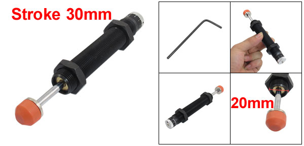 Product Name Pneumatic Shock Absorber Model NO. AD2030 Stroke 30mm/ 1.18" Rod Diameter 6mm/ 0.23" Threaded Diameter 20mm/ 0.78" Overall Size 165 x 30mm/ 6.4" x 1.1" (L*D) Color Black,Orange Material Plastic, Metal Weight 238g Package Content 1 x Pneumatic Oil Pressure Shock Absorber - Reviews