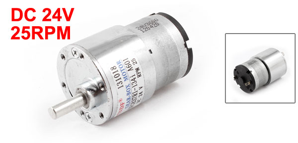 Details6mm Shaft 25RPM Output Speed 24V Reduce DC Magnetic Geared Motor  Product Name DC Geared Motor Model DFGB37RI-124i Rated Voltage DC 24V Output Speed 25RPM Mounting Screw Hole Diameter 2.5mm/0.1" Gearbox Size 35 x 55mm/1.4" x 2.2"(D*H) Shaft Size 6 x 15mm/ 0.24" x 0.6"(D*L) Body Lenght 75mm/ 2.8" Main Color Bronze Tone, Silver Tone Material Metal, Magnetic Net Weight 158g Package 1 x DC Geared Speed Reduce Motor