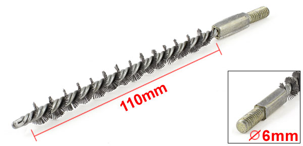 Product Name Steel Wire Tube Brush Material Steel, Metal Main Color Silver Tone Threaded Diameter 6mm/0.24" Bristle Brush Length 110mm/4.3" Total Size 165 x 10mm/ 6.5" x 0.39"(L*D) Net Weight 25g Package Content