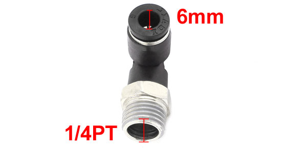 Product Name Quick Fittings Design Male Thread L Shaped Connect Type Male Thread 13mm/1/4PT Fit Tube Outside Dia 6mm/0.23" Material Plastic, Brass Dimension (Approx) 32 x 25 x 15mm/ 1.3" x 1" x 0.8" (L*W*H) Color Silver Tone, Black Net Weight 14g Package Content 1 x Quick Fittings - Reviews