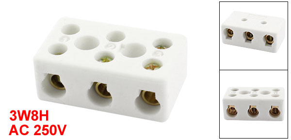 Product Name Ceramic Terminal Block Type 3W8H Rating Voltage AC 250V Max. Withstand Temperature 600°C Wiring Hole Diameter 6mm/0.24" Total Size 48 x 28 x 19mm/1.9" x 1.1" x 0.75"(L*W*T) Materials Ceramic Main Color White Net Weight 57g Package Content 1 x Ceramic Terminal Block - Reviews