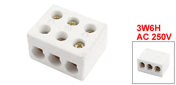 Product Name Ceramic Terminal Block Type 3W6H Rating Voltage AC 250V Max. Withstand Temperature 600°C Wiring Hole Dia 6mm/0.24" Total Size 36 x 29 x 21mm/1.4" x 1.1" x 0.83"(L*W*T) Materials Ceramic Main Color White Net Weight 46g Package Content 1 x Ceramic Terminal Block - Reviews