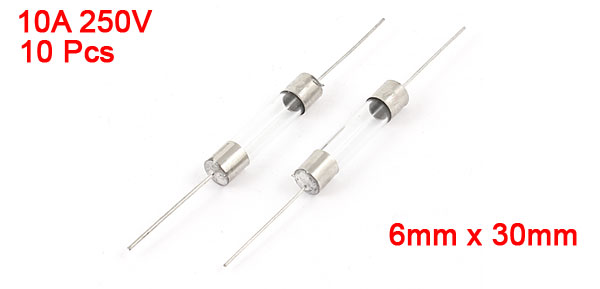 Product Name Fuse Tube Type Fast Acting Rated Power AC 250V 10A Fit Fuse Size 6 x 30mm/ 0.24" x 1.2" (D*L) Total Size 0.6 x 76mm/ 0.024" x 3" (D*L) Main Color Silver Tone, Clear Main Material Metal, Glass Weight 12g Package 10 x Fuse Tube - Reviews