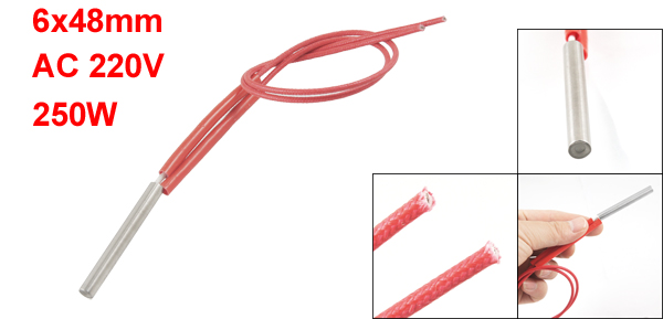 Product Name Cartridge Heater Material Stainless Steel, PVC, Nylon Rated Voltage AC 220V Power 250W Heater Size (Approx.) 6 x 48mm/0.23" x 1.8"(D * L) Wire Length (Approx.) 30cm / 11.1" Color Red, Silver Tone Weight 17g Package Content 1 x Cartridge Heater - Reviews