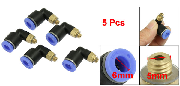 Product Name Pneumatic Quick Coupler Material Plastic, Metal Thread Diameter 5mm/ 0.197" Tube Diameter 6mm/ 0.236" Total Size (Each ) 23 x 23 x 13mm/0.9" x 0.9" x 0.51" (L*W*T) Color Black, Blue, Gold Tone Weight 33g Package Content 5 x Pneumatic Quick Coupler - Reviews