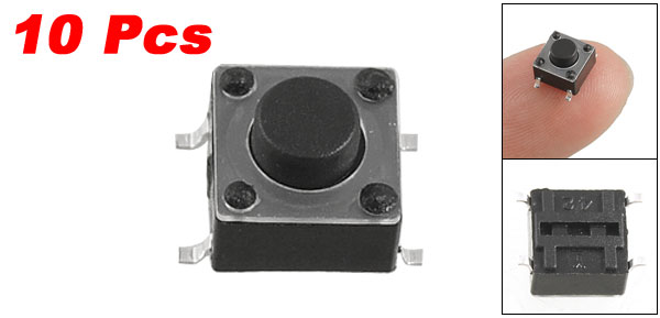 Details6mm x 6mm x 5mm 4pin SMD SMT Momentary Tactile Push Button Switch 10Pcs  Product Name Tact Switch Contact Type Momentary Contact Mounting Type SMD Dimension 6 x 6 x 5mm / 0.24" x 0.24" x 0.2" (L*W*H) Button Dia. 3mm / 0.12" Pin Pitch 4.5mm / 0.18" Material Plastic, Metal, Electric Parts Color Black, Silver Tone Net Weight 2g Package Content 10 x Tact Switches