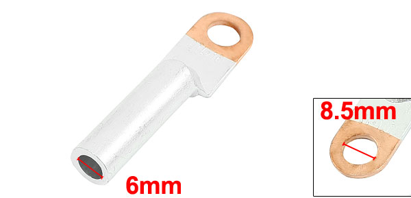 Product Name Copper Cable Lug Model 16mm² Material Copper Inner Diameter 6mm / 0.24" Bolt Hole Diameter 8.5mm / 0.33" Tip Width 15mm / 0.59" Total Length 63mm/ 2.5" Color Silver Tone Weight 10g Package Content 1 x Copper Cable Lug - Reviews
