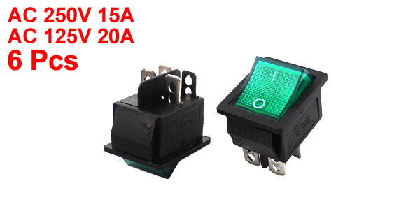 6Pcs DPST 4Pin Green Head Rectangle Boat Rocker Switch AC250V 15A AC125V 20A