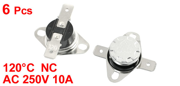 Product Name Temperature Control Switch Model.No KSD301 Action Type Normally Closed(NC) Action Temperature 120°C Voltage & Current AC 250V, 10A Total Size (Each) 34 x 18 x 12mm / 1.3" x 0.71" x 0.47"(L*W*H) Mounting Hole Size 4.5 x 3.5mm/0.18" x 0.14"(L*W) Material Metal, Plastic Color Black, Silver Tone Total Weight 29g Package Content 6 x Temperature Control Switches - Reviews