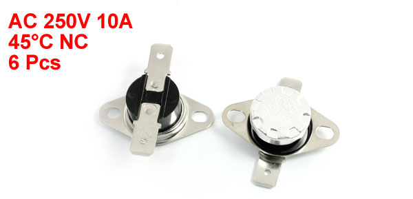 Product Name Temperature Control Switch Model.No KSD301 Action Type Normally Closed(NC) Action Temperature 45°C Voltage & Current AC 250V, 10A Total Size (Each) 34 x 18 x 12mm / 1.3" x 0.71" x 0.47"(L*W*H) Mounting Hole Size 4.5 x 3.5mm/0.18" x 0.14"(L*W) Material Metal, Plastic Color Black, Silver Tone Total Weight 29g Package Content 6 x Temperature Control Switches - Reviews