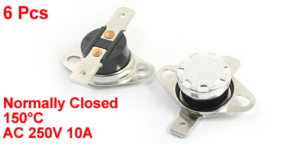 Product Name Temperature Control Switch Model.No KSD301 Action Type Normally Closed(NC) Action Temperature 150°C Voltage & Current AC 250V, 10A Total Size (Each) 34 x 18 x 12mm / 1.3" x 0.71" x 0.47"(L*W*H) Mounting Hole Size 4.5 x 3.5mm/0.18" x 0.14"(L*W) Material Metal, Plastic Color Black, Silver Tone Total Weight 29g Package Content 6 x Temperature Control Switches - Reviews