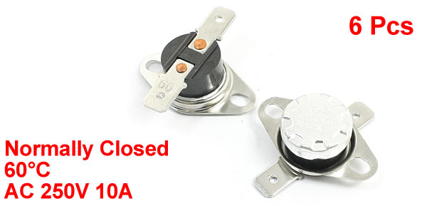 Details6pcs KSD301 Normally Closed 60C Thermostat Temperatur Controlled Switch  Product Name Temperature Control Switch Model.No KSD301 Action Type Normally Closed(NC) Action Temperature 60°C Voltage & Current AC 250V, 10A Total Size (Each) 34 x 18 x 12mm / 1.3" x 0.71" x 0.47"(L*W*H) Mounting Hole Size 4.5 x 3.5mm/0.18" x 0.14"(L*W) Material Metal, Plastic Color Black, Silver Tone Total Weight 29g Package Content 6 x Temperature Control Switches