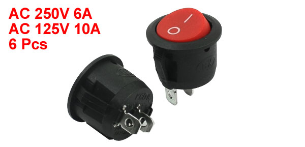6Pcs SPST ON/OFF 2 Pin Red Headed Round Boat Rocker Switch AC250V 6A AC125V 10A