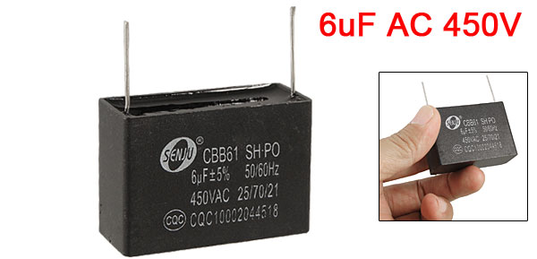 Product Name Motor Capacitor Housing Material Plastic Dielectric Material Polypropylene Film Model CBB61 Capacitance 6uF Tolerance ±5% Rated Voltage 450V AC Frequency 50/60Hz Lead Spacing(Approx.) 4.2cm/1.7'' Lead Length 2cm/0.8'' Overall Size 4.8 x 2 x 5.1cm/1.9'' x 0.8'' x 2'' (L*W*H) Color Black Weight 184g Package Content 1 x Motor Capacitor - Reviews