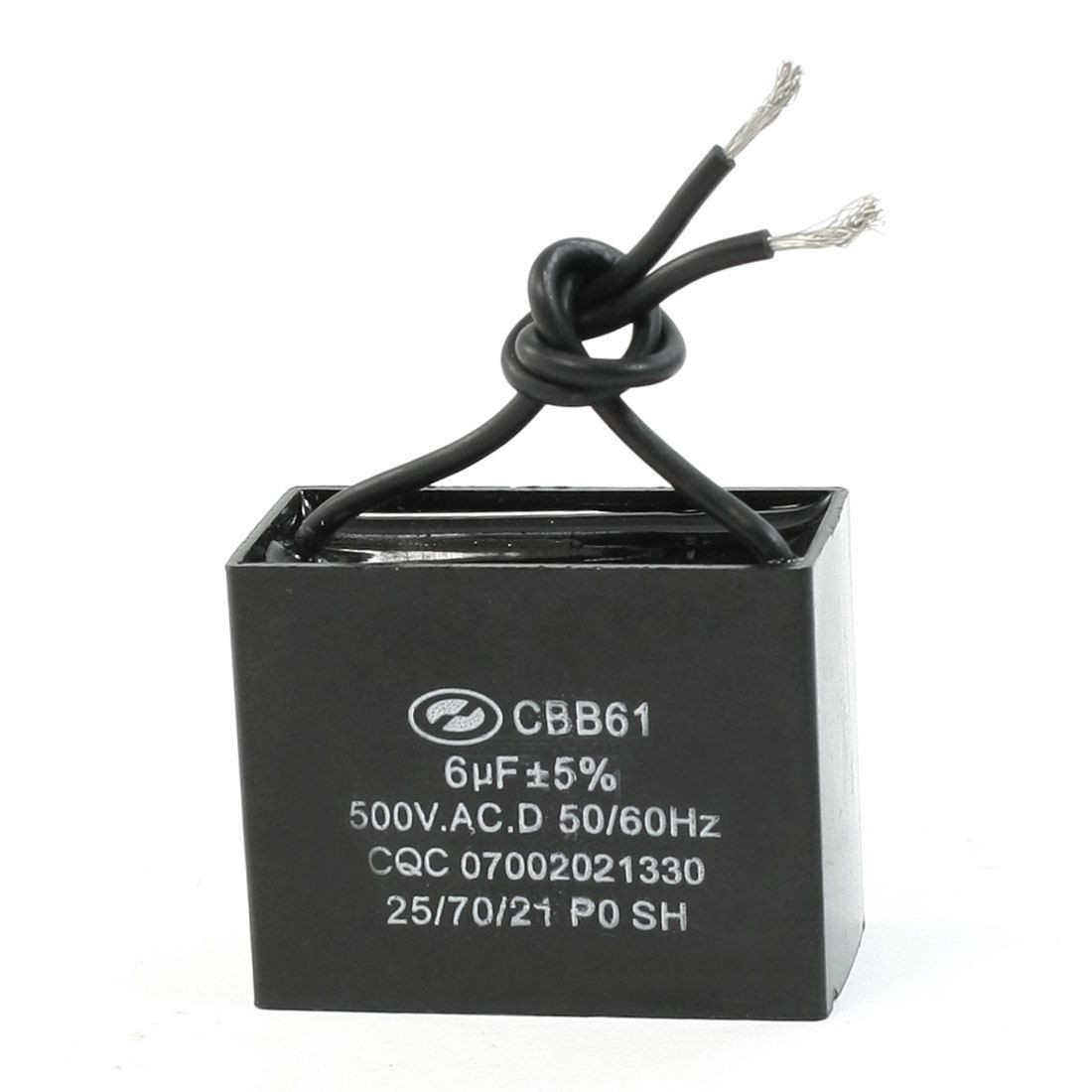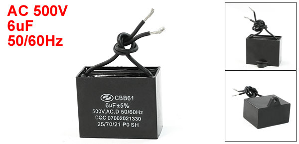 Product Name Motor Capacitor Model CBB61 External Material Plastic Dielectric Material Metalized Polypropylene Film Rated Capacitance 6uF Tolerance ±5% Rated Frequency 50/60Hz Rated Voltage AC 500V Body Size 48 x 24 x 38mm/ 1.9" x 0.9" x 1.5"(L*W*T) Fixing Hole Diameter 4mm/0.16" Cable Length 8.5cm/3.3" Net Weight 53g Package Content 1 x Motor Run Capacitor - Reviews