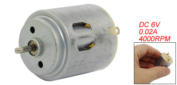 Product Name DC Motor Rated Voltage DC 6V Rated Current 0.02A Speed 4000RPM Shaft Diameter 2mm / 0.078" Shaft Length 7mm / 0.275" Body Diameter 24mm / 0.944" Total Length 40mm / 1.574" Main Color Silver Tone Material Metal Weight 27g Package 1 x DC Motor - Reviews