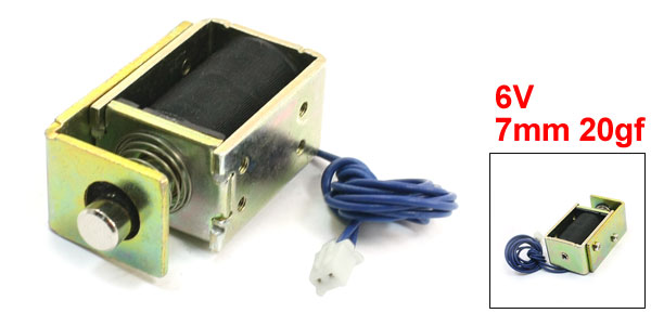 Product Name Door Solenoid Rated Voltage 6V Stroke & Force 7mm, 20gf Power 0.9W Current 0.15A Action Form Pull Type Body Size 48 x 28 x 21mm/1.9" x 1.1" x 0.83"(L*W*H) Cable Length 35cm/ 13.8" Material Metal, Electronic Parts Weight 117g Package Content 1 x Door Solenoid Electromagnet - Reviews