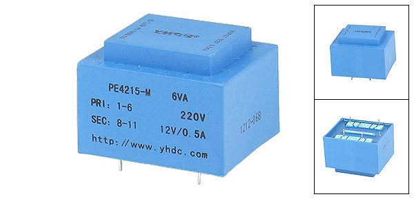 Product Name Encapsulated Transformer Model PE4215-M Power 6VA, 50/60 Hz Input 220V Output 12V / 0.5A Pins Quantity 4 Distance Between Input Pins 25mm Distance Between Output Pins 15mm Total Size(Approx.) 44.5 x 37.5 x 40.3mm/1.75" x 1.48" x1.59"(L*W*H) Color Blue Weight 197g Package Content 1 x Encapsulated Transformer - Reviews