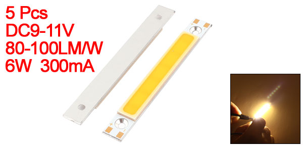 Product Name COB LED Lamp Beads Rated Voltage DC9-11V Luminous Flux 80-100LM/W Color Temperature 2800-3000K Power 6W Current 300mA Light Color Warm White Material Aluminum Color Silver Tone, Orange Size 52 x 6mm/ 2.1 x 0.23"(L*W) Luminous Surface 36 x 6mm/ 1.4" x 0.23"(L*W) Weight 9g Package Content 5 x COB LED Lamp Beads - Reviews