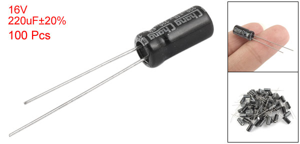 Product Name Aluminum Electrolytic Capacitor Type Radial Lead Maximum Temperature 105°C Withstand Voltage 16V Capacitance 220uF Capacitance Tolerance ±20% Body Size 6 x 12mm / 0.24'' x 0.47'' (D*L) Lead Spacing 2.5mm / 0.098'' Lead Length 27mm / 1.06'', 21mm / 0.83'' External Material Aluminum Weight 41g Color As Picture Shown Package Content 100 Pcs (±2%) x Electrolytic Capacitors - Reviews