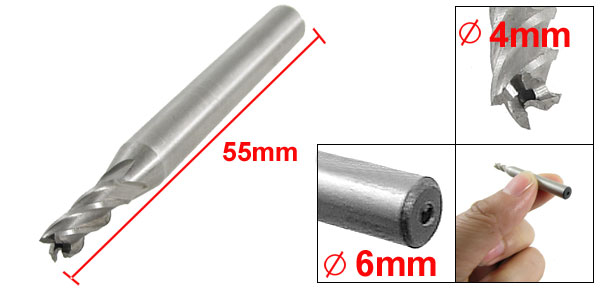 Product Name End Mills Cutter Material HSS-AL Color Gray Cutting Dia 4mm/5/32" Cutting Depth 11mm/7/16" Shank Diameter 6mm/15/64" Total Length 55mm/2.1'' Net Weight 10g Package Content 1 x End Mills Cutter - Reviews