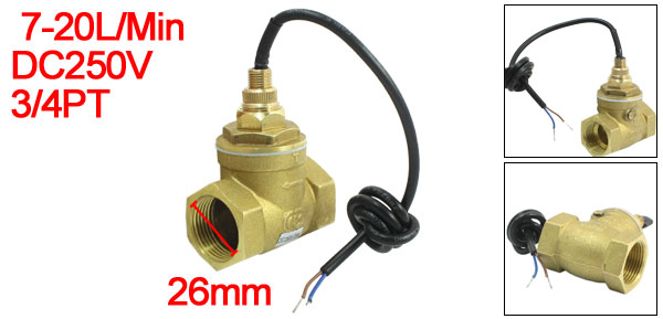 Product Name Paddle Water Flow Switch Model SEN-DB20 Max. Switch Power 70W Max. Working Flow Rate 7-20L/MIN Max. Voltage DC250V Max. Switch Current 1A Working Temperature 60°C(Max.) Inner Thread Dia. 26mm Female Port Thread Dia 3/4PT Body Size 59 x 37 x 75mm / 2.3" x 1.5" x 3"(L*W*T) Cable Length 46cm / 18.1" Material Brass Color Gold Tone Weight 300g Package Content 1 x Paddle Water Flow Switch - Reviews