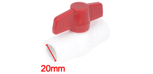 Product Name Ball Valve Ends Type Slip x Slip Slip End Size 20mm x 20mm/7/8" x 7/8" Handle Size 6.9 x 2.1cm / 2.7" x 0.8" (L*Max.W) Overall Size (Approx.) 8 x 3.8cm / 3.1" x 1.5" (L*Max.W) Color White, Red Material PVC-U Net Weight 87g Package 1 x Ball Valve - Reviews