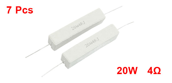 Details7 Pcs 4 Ohm Resistance 5% Radial Lead Ceramic Cement Resistors 20W  Product Name Cement Resistor Power 20W Resistance 4Ω Tolerance ±5% Body Size (Approx.) 6 x 1.2 x 1.1cm/ 2.4" x 0.47" x 0.43" (L*W*H) Lead Diameter (Approx.) 0.7mm/ 0.03" Lead Length (Approx.) 25mm/ 1" Body Material Ceramic, Cement Color White, Silver Tone Weight 141g Package Content 7 Pcs x Cement Resistors