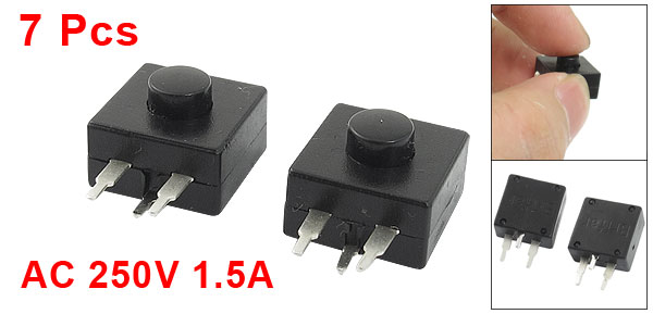 Product Name Torch Push Button Switch Contact Type Latching Contact Voltage/ Current AC 250V 1.5A Pin Number 3(Single Row) Terminal Driection Horizontal Overall Size 12 x 12 x 9mm/ 0.5" x 0.5" x 0.35" (L*W*H) Button Diameter 5mm/ 0.2" Material Plastic, Metal, Electric Parts Color Black, Silver Tone Weight 9g Package Content 7 x Torch Push Button Switch - Reviews