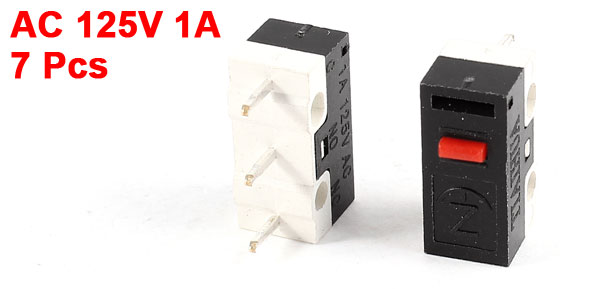 Product Name Micro Limit Switch Action Type Momentary Contact Type SPDT 1NO 1 NC Actuator Type Push Button Type Voltage/ Current AC 125V 1A Switch Body Size(Each) 13 x 7 x 6mm/0.51" x 0.28" x 0.24"(L*W*H) Material Plastic & Metal Color Black, White, Red Net Weight 6g Package Content 7 x Micro Limit Switch - Reviews