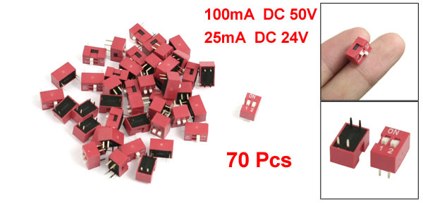 70 Pcs 2.54mm Pitch 2 Positions Slide Type DIP Switch Red