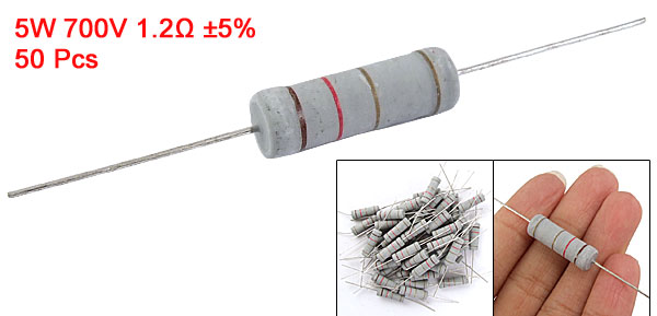 Product Name Metal Oxide Film Resistors Power Rating 5W Resistance Value 1.2 Ω Resistance Tolerance ± 5% Withstang Voltage 700V Lead Size (Each End) 30 x 0.5mm / 1.18" x 0.019" (L*D) Body Size (Approx.) 24 x 7.3mm / 0.94" x 0.287" (L*D) Color As Picture Shown Weight 189g Package Content 50(±2%) x Metal Oxide Film Resistors - Reviews
